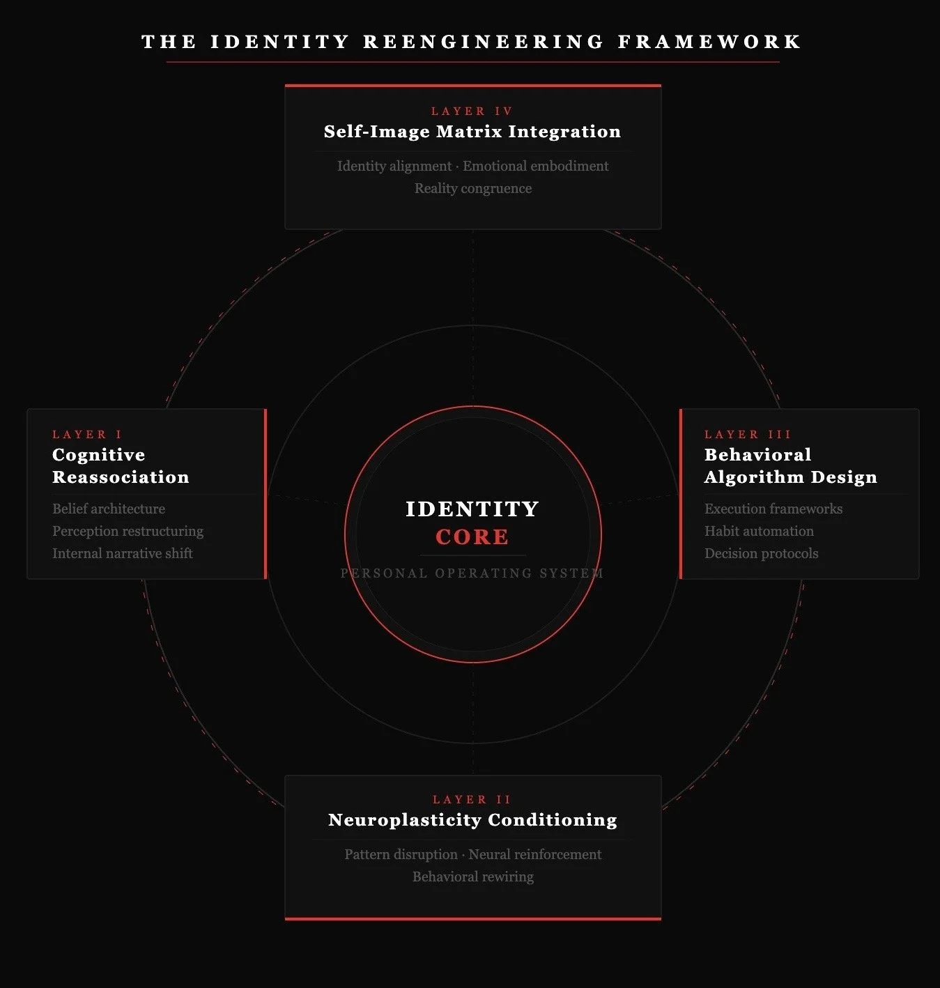 Total reconstruction. Every domain of your life — identity, performance, discipline, and standard — rebuilt with precision and private access.